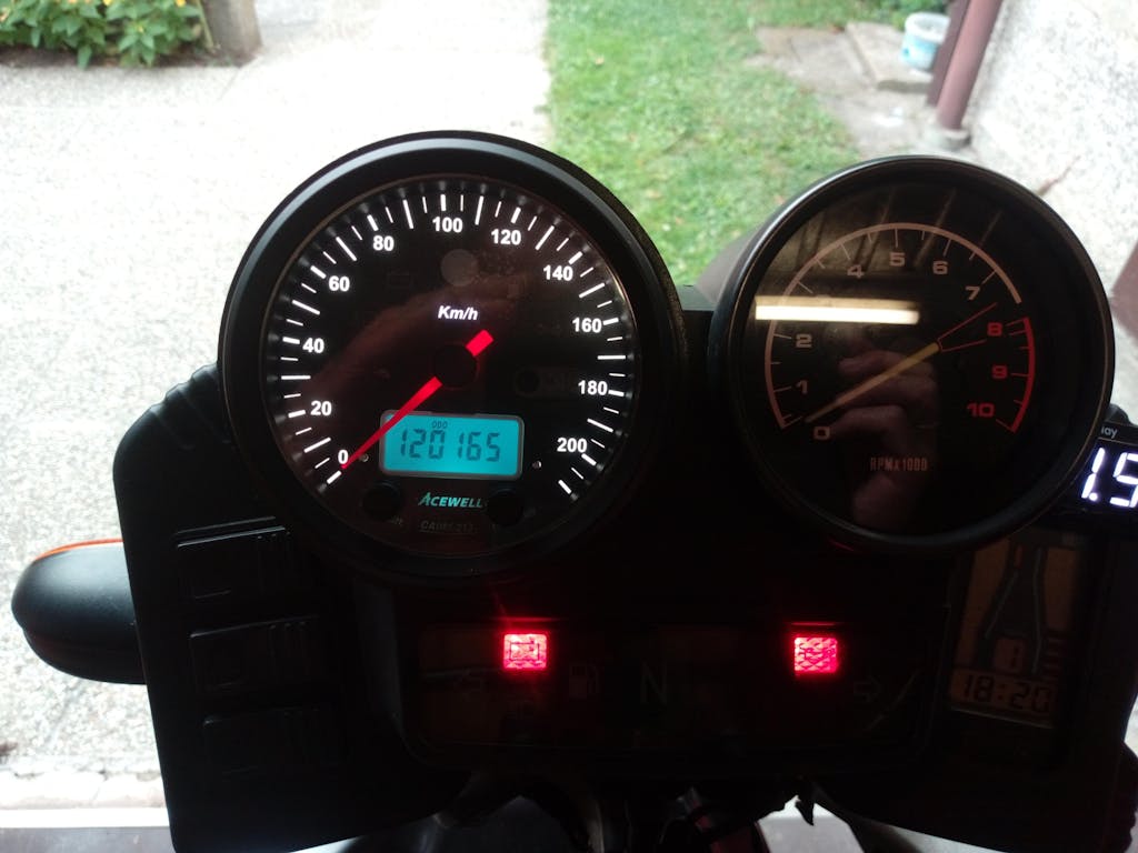 Toller Tachometer, Ich habe die originalen Kontrollleuchten und den Drehzahlmesser meines BMW R1100GS Gespannes beibehalten und nur den Tachometer ausgetauscht. Da ich auf einen etwas kleineren Rollerreifen am Vorderrad umgestiegen bin, hat der Originaltachometer trotz Ausgleichgetriebes ziemlich falsch angezeigt. Durch die Einstellmöglichkeit der Radumfanges zeigt er Jetzt die tatsächlich gefahrene Geschwindigkeit (verglichen mit dem Navigationsgerät). Da ich die Öltemperaturanzeige bereits im Originalcockpit habe verwende ich den Temperaturfühler für die Umgebungstemperatur. Mal schauen, ob während der Fahrt ein realistischer Wert angezeigt wird. Der Tachometer ist auf jeden Fall sein Geld wert.