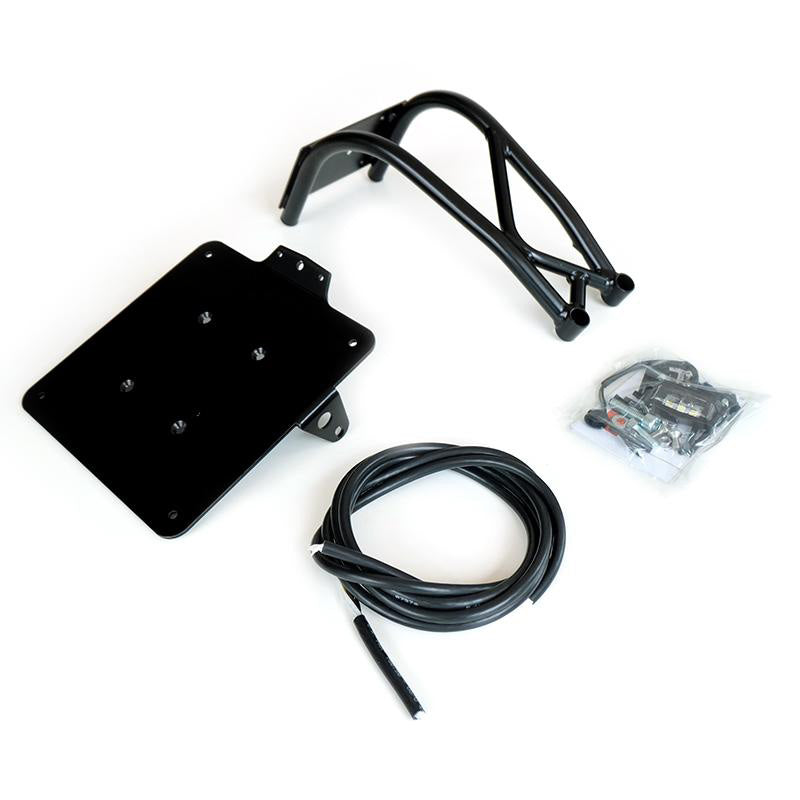 Hergestellt aus Stahlrohr mit mattschwarzer Epoxidpulverbeschichtung, komplett mit Kennzeichenhalter aus Aluminium mit Halterungen für Original- oder Aftermarket-Pfeile (Pfeile nicht im Lieferumfang enthalten). Wird mit LED-Kennzeichenbeleuchtung geliefert. Die Verlängerung der Verkabelung für Scheinwerfer und Blinker ist im Lieferumfang enthalten, das Kabel wird im Rohr geführt. Maße Kennzeichenhalter: 187 x 187 mm