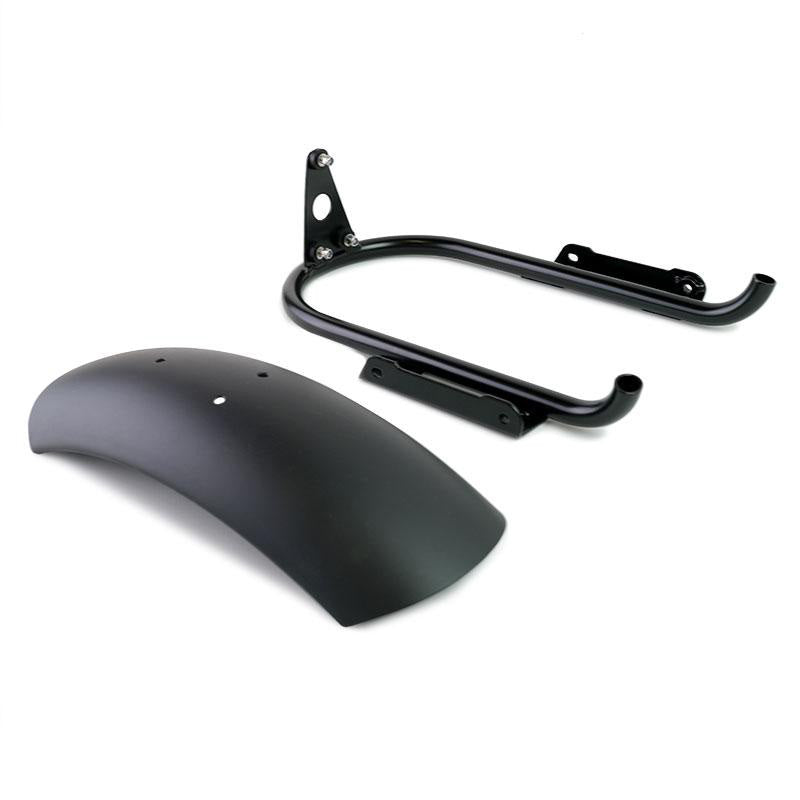 Es ersetzt den gesamten originalen vorderen Kotflügel im perfekten "Old School" -Stil. Es ist mit einem Stahlrohr zur Befestigung an den Gabelbeinen ausgestattet, mit einem mattschwarzen Finish mit Epoxidpulver. Komplett mit vorderem Kotflügel aus Aluminium mit mattschwarzer/silberner Oberfläche.