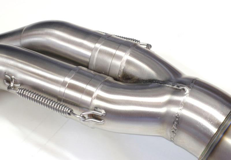 Komplett von Hand gefertigter Edelstahlbeschlag mit Titananschluss im perfekten Moto-GP-Stil.