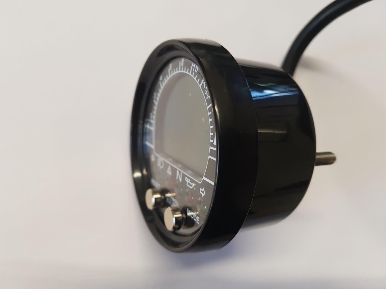 Vorraussichtliche Lieferung: 04.11.2025 - 07.11.2025Motorrad Tachometer mit LED Kontrollleuchten, Drehzahlmesser, Schaltwarnung, Tankanzeige und Straßenzulassung (ABE). Das Rundinstrument ist mit Aluminium Gehäuse (poliert & schwarz matt) ebenso wie ohne Gehäuse erhältlich.